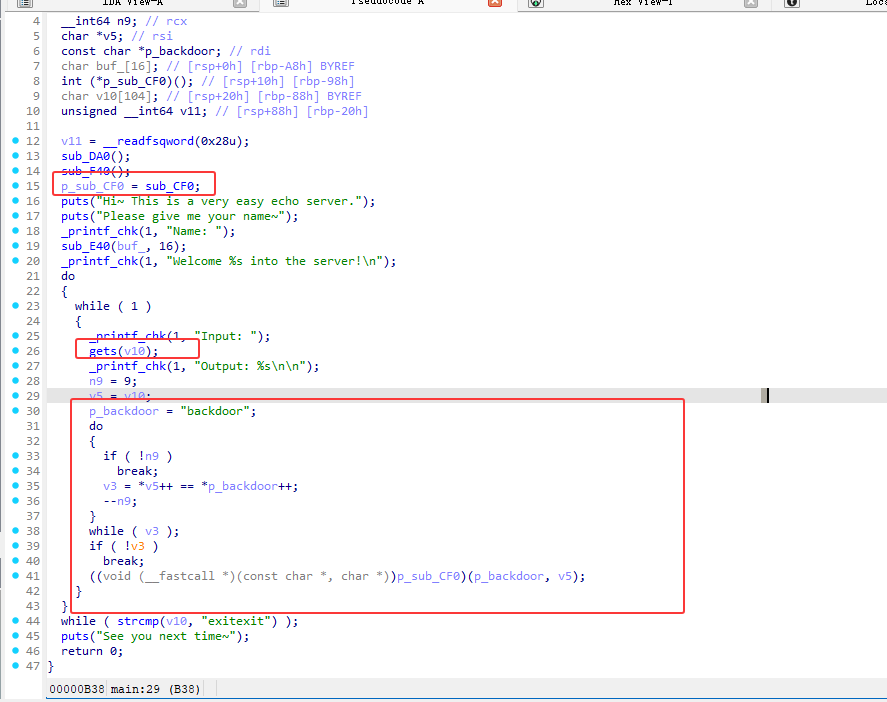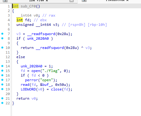 程序大致内容就是输入用户名 name 并且输出出来,当后续输入backdoor 调用p_sub_CF0->sub_CF0,打开 flag 文件,将其内容存入 bss 段